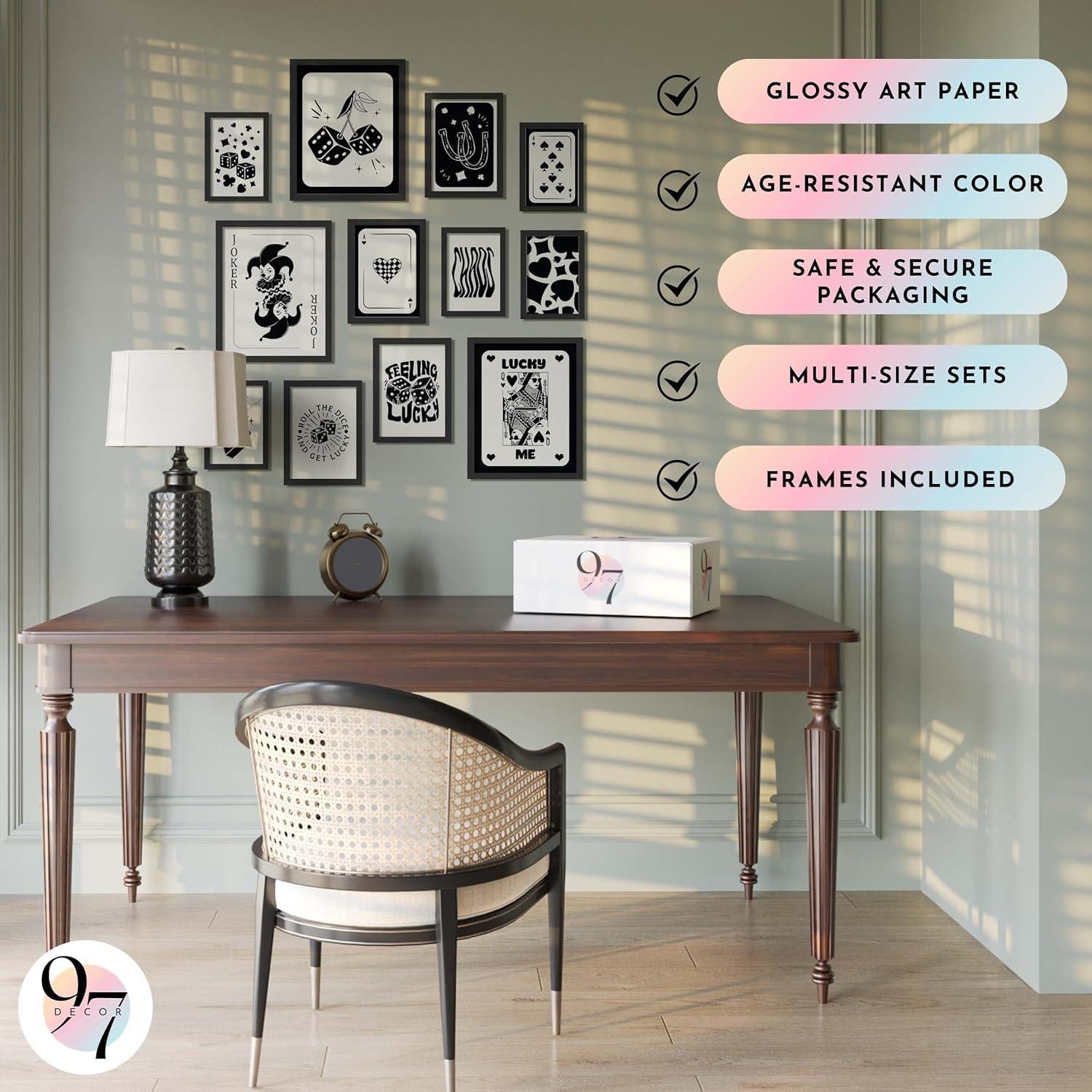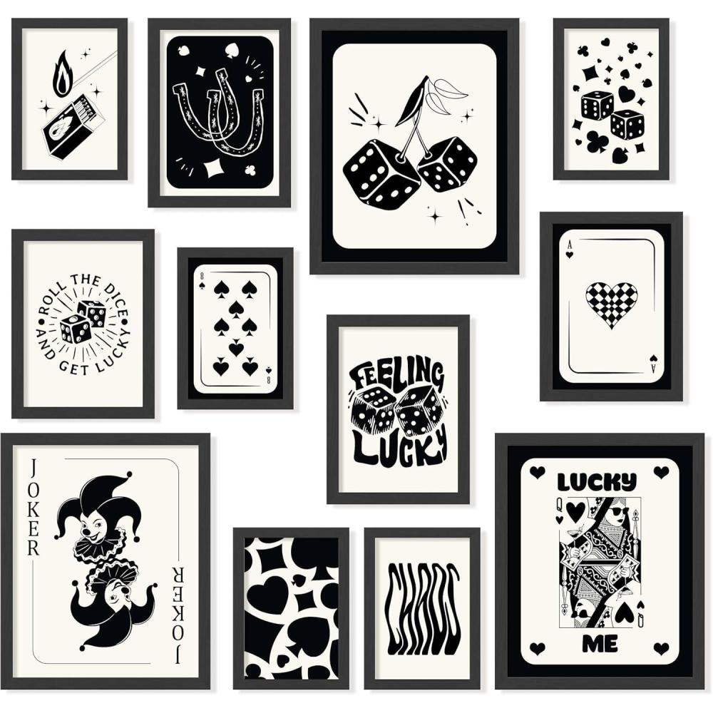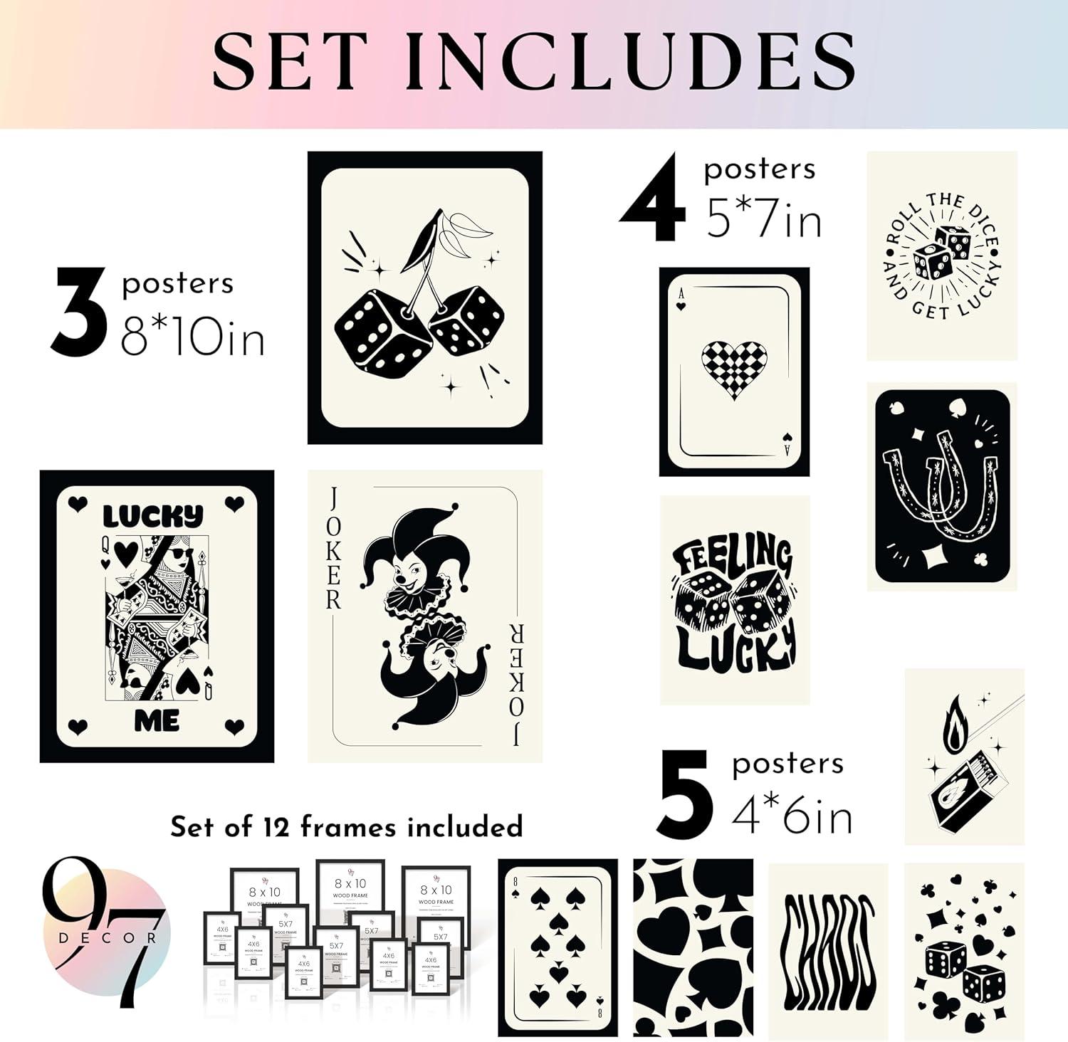 Set Includes: Dive into a curated selection of 3 pcs 8×10 inch, 4 pcs 5×7 inch, 5 pcs 4×6 inch (ALL FRAMED) playing card wall art and poker wall art, including striking poker pictures for wall display and a captivating queen of hearts poster. Our collection is rounded out with ace wall art and the ace of spades wall art, crafted in stylish black and beige art tones for a sophisticated look.