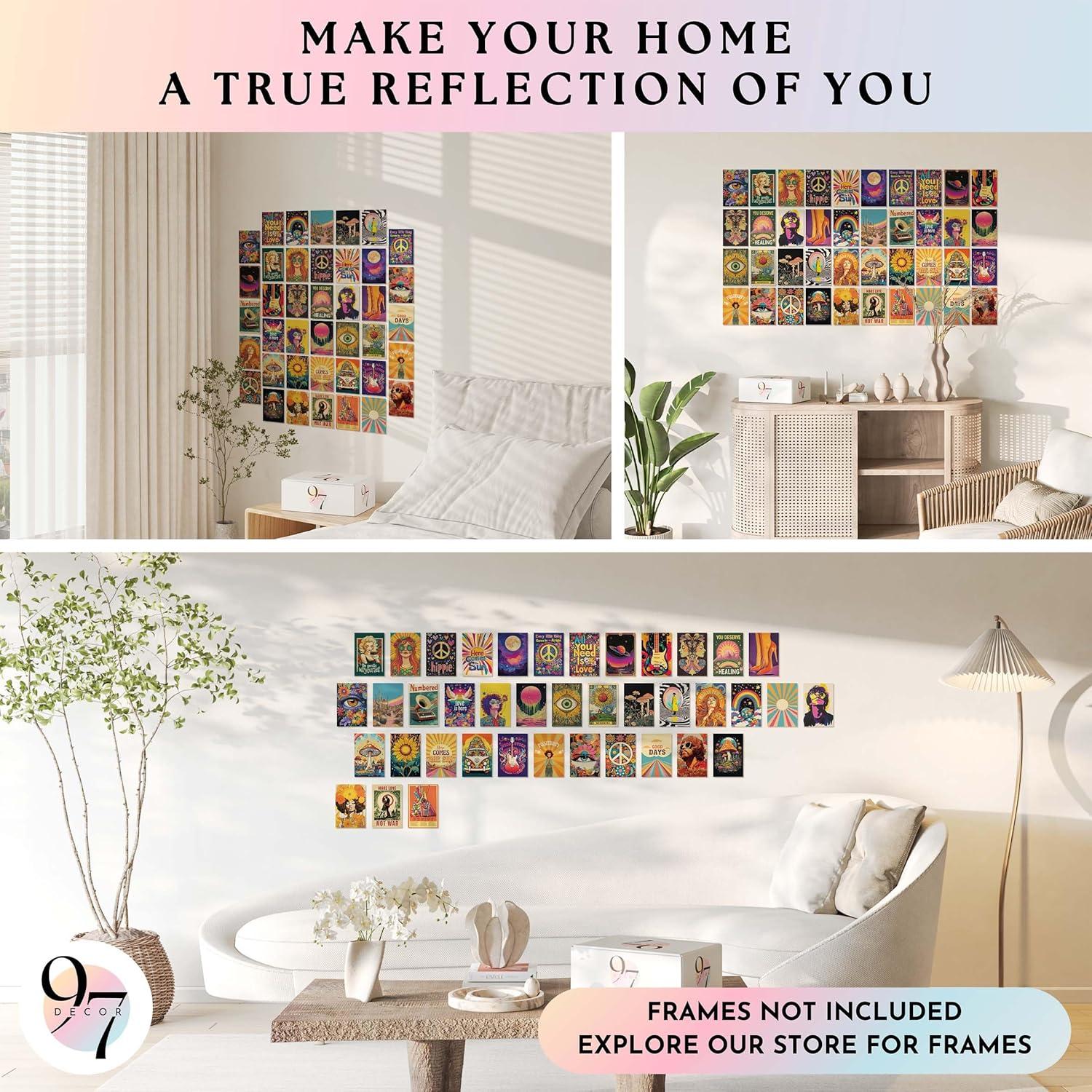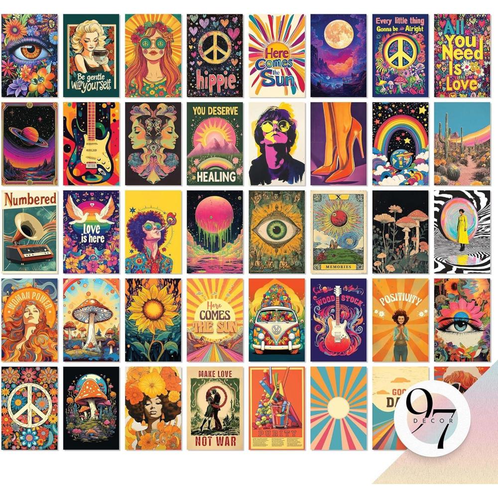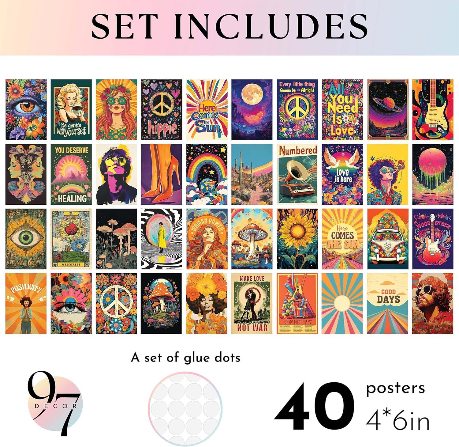 Hippie Wall Art – Transform your space with this 40-piece set of 4″”x6″” hippie wall art prints. Perfect for hippie room decor, these prints bring a retro decor 70s, 70s wall decor, and groovy decor vibe, ideal for creating a vintage atmosphere