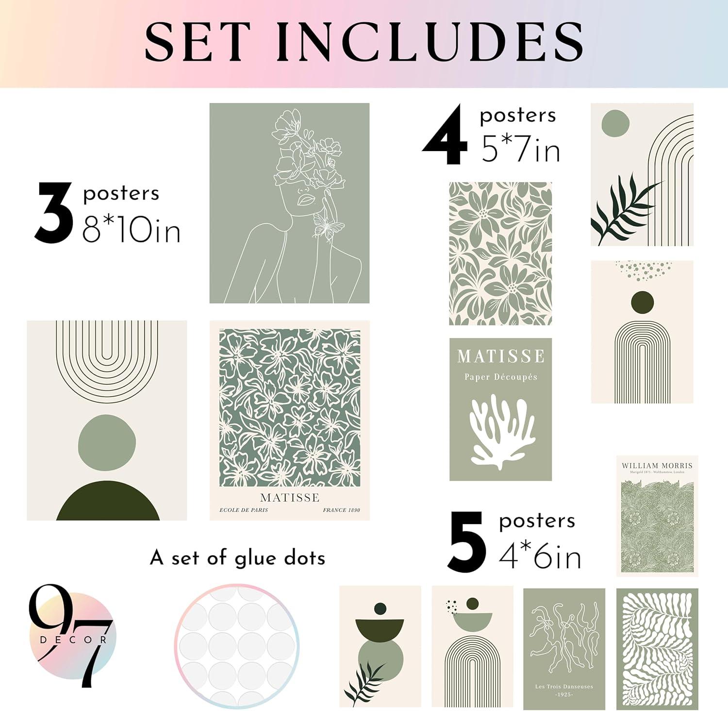 Set Include: includes 3pcs of 8×10, 4pcs of 5×7, and 5pcs of 4×6 inch prints, featuring sage green posters, olive green wall decor, and green abstract wall art for a cohesive and stylish setup.